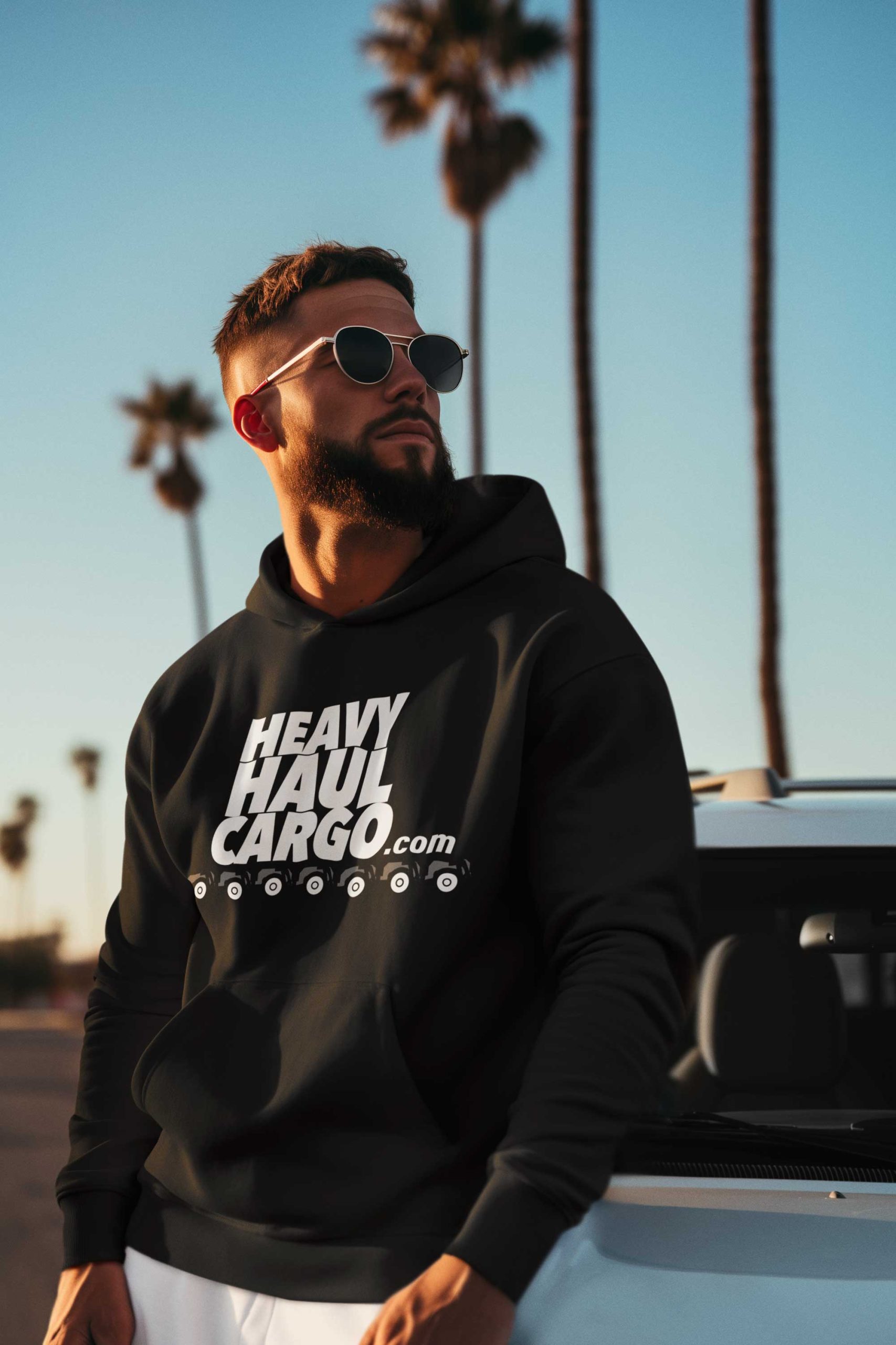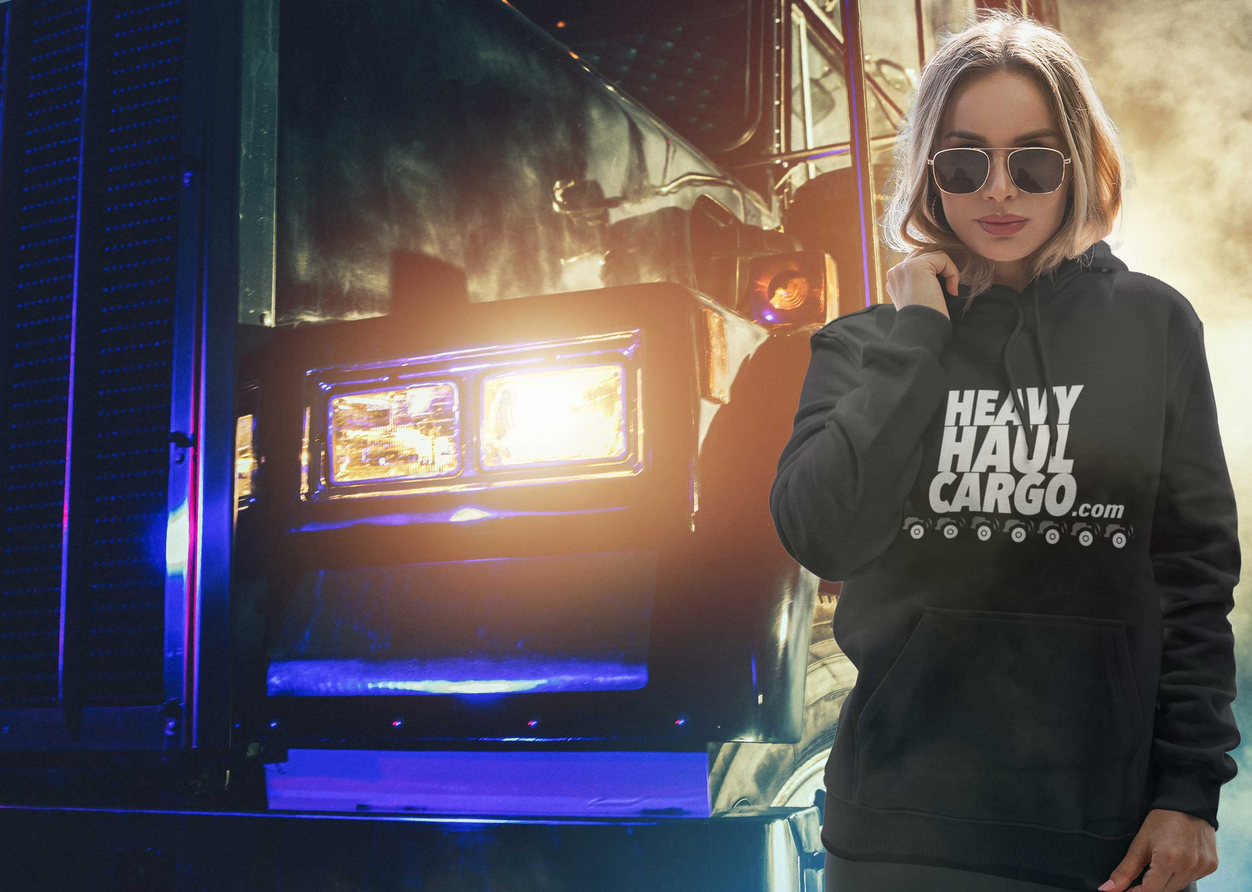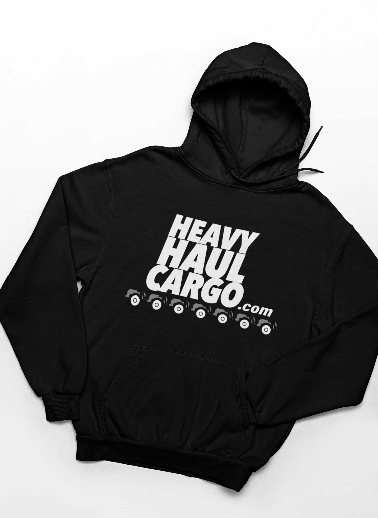 Oversized pullover hoodie with HeavyHaulCargo.com text on the multi-axle hydraulic lift trailer on the front.